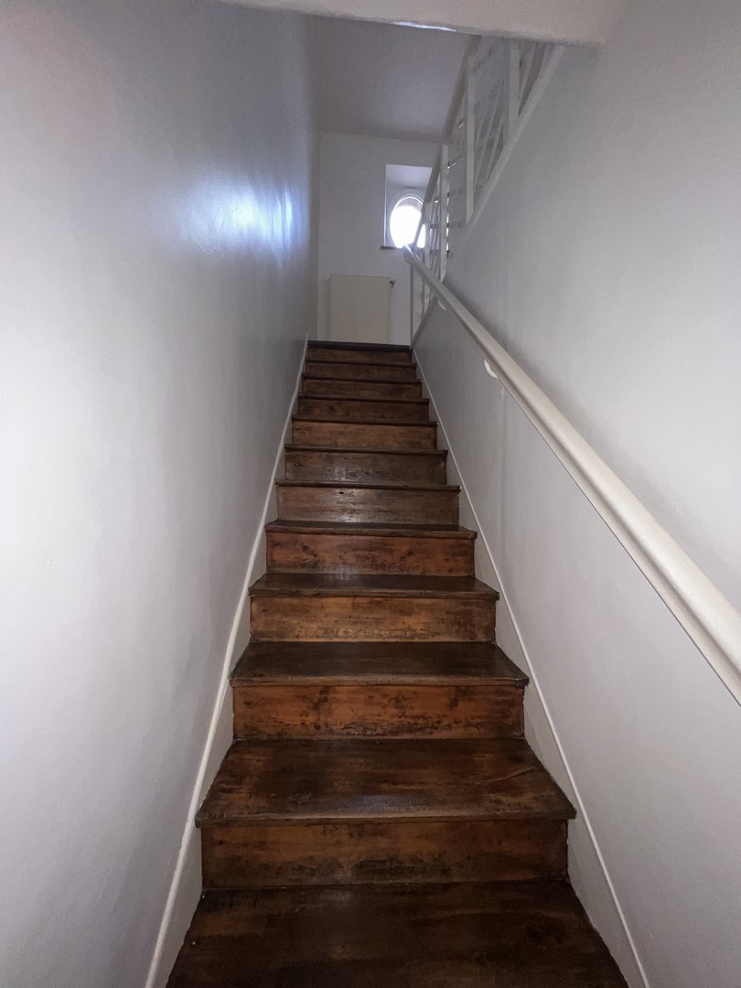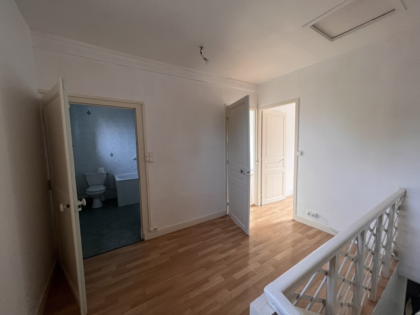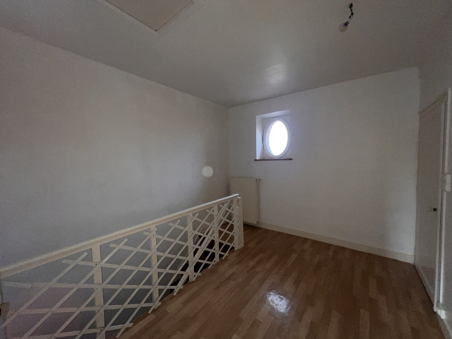 Charmante Maison de ville (pas de jardin), proche commerces, offrant : Une entrée, une salle à manger et une partie séjour, une grande cuisine avec cellier, un wc. A l'étage, un grand palier pouvant servir de bureau, 2 chambres et une , salle de bains avec wc.