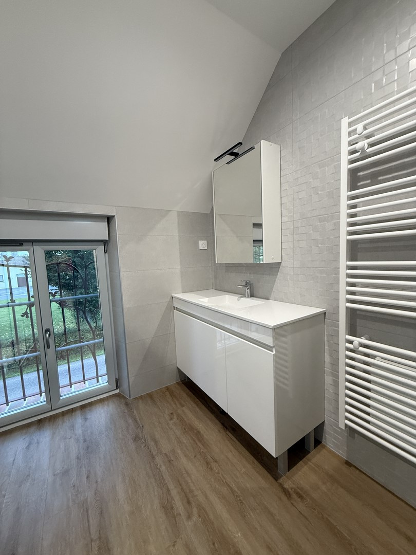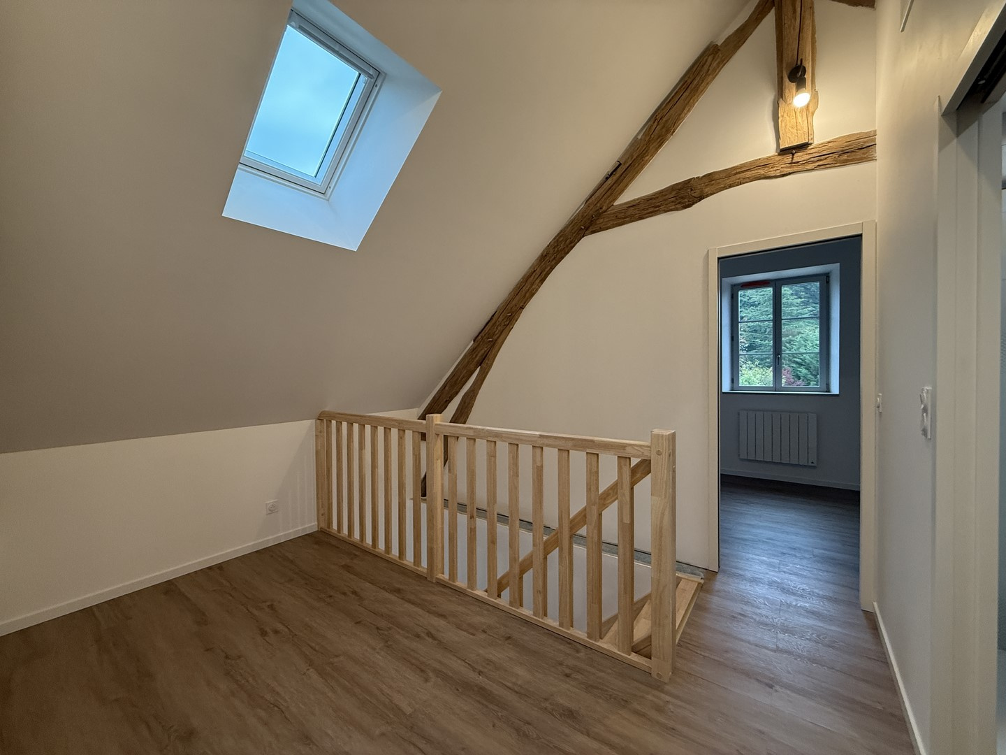 À l’étage, un palier pouvant faire office d’espace bureau distribue deux chambres supplémentaires ainsi qu’une salle de douches avec wc.